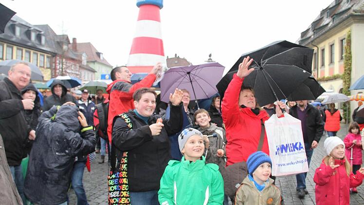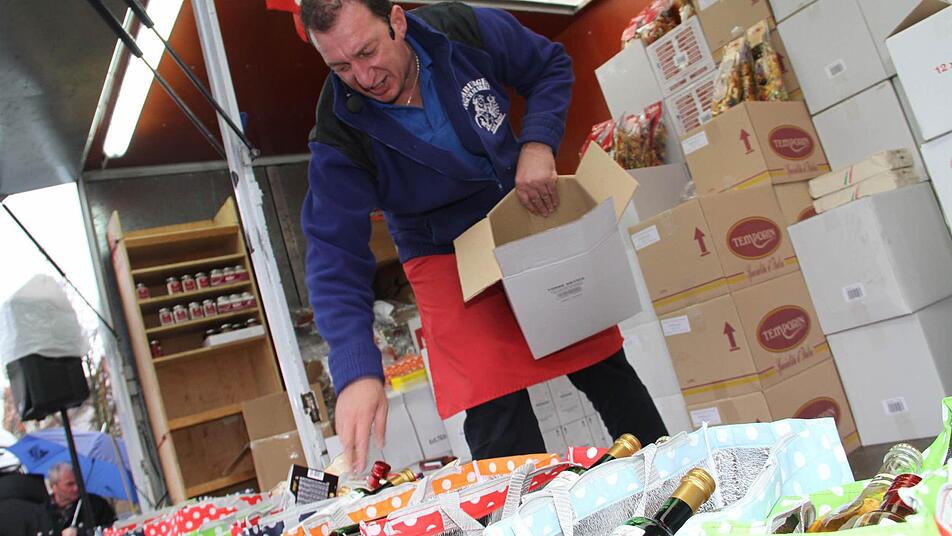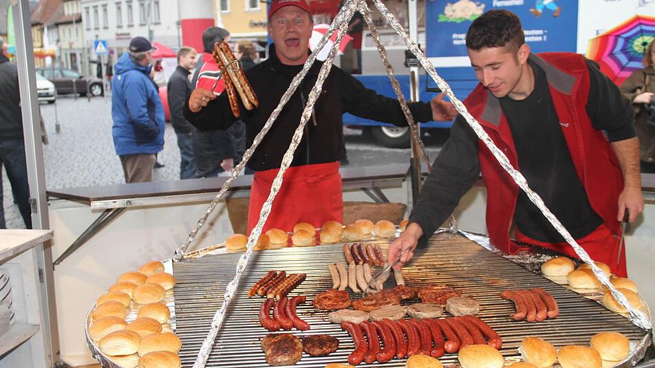 Unterdessen plärrten sich auf dem Lichtenfelser Marktplatz Käse-Rudi, Wurst-Herby, Aal-Hinnerk und Nudel-Kiri die Seele aus dem Leib. Vor manchen Verkaufswagen reckten sich alle Hände in die Höhe, wenn die Händler Würste und ganze Nudelpackungen ins Volk schmissen.