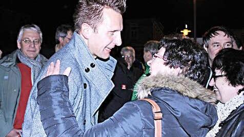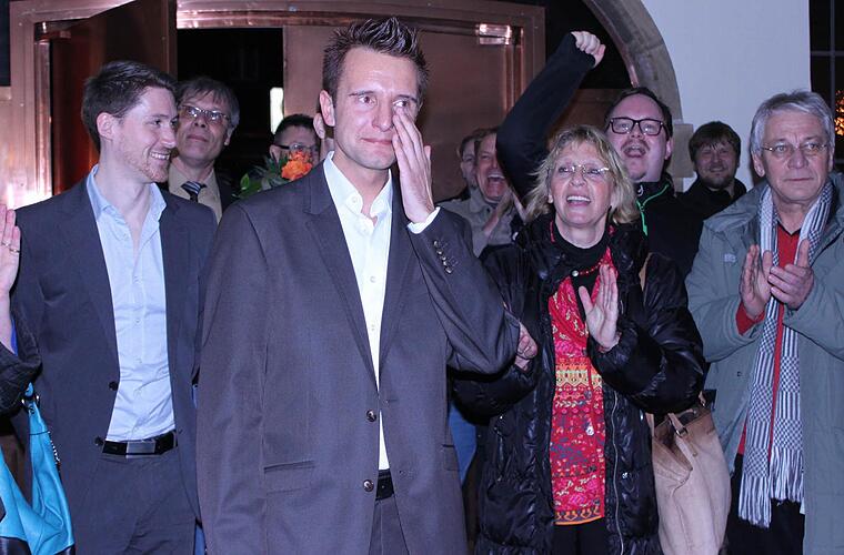 Knapp zwei Stunden später sollte dann aber auch die Gelassenheit des Marathonläufers, der am Morgen mit einem 27-Kilometer-Lauf in diesen Sonntag gestartet war, etwas schwinden. Zu beeindruckend wohl die Deutlichkeit des Ergebnisses. Als er auf dem Marktplatz erschien und der Jubel aufbrandete, standen dem designierten Bürgermeister Tränen in den Augen. Es dauerte etwa eine halbe Stunde, bis er sich den Weg ins Rathaus gebahnt hatte. Man sah viele glückliche Gesichter, viele Hände, die der Wahlsieger schüttelte. Sektkorken knallten und ein paar Kästen Bier wurden eilig herbeigeschafft.