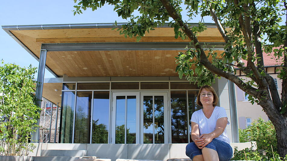 Sabine Grießer, die Leiterin der zukünftigen BRK-Tagespflege "Am Mühlbach“, freut sich, dass das Gebäude (im Bild der Anbau) bald fertiggestellt ist.