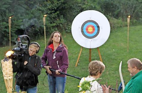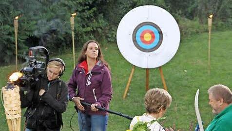 Bogenschießende Moderatorin Doch diese gehören schon einige Jahrzehnte der Vergangenheit an. Eine Skiabteilung gibt es bei den Freizeitfreunden keine mehr, dafür aber eine Bogenabteilung. Abteilungsleiter Bernd Freisleben und sein Stellvertreter Dieter Lunz haben einen Bogen mitgebracht. Auf der kleinen Rasenfläche unterhalb der Terrasse darf sich Carolin Reiber unter Anleitung von Dieter Lunz im Bogenschießen üben. Der Pfeil trifft zwar nicht ins Schwarze, aber immerhin die Scheibe.