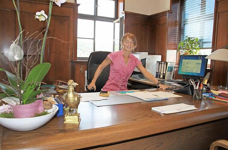 Die im März neu gewählte Bürgermeisterin war bislang mit anderen Dingen beschäftigt, als sich um die Einrichtung ihres Arbeitszimmers zu kümmern. Sie weiß längst, dass für eine große Umgestaltung kein Geld da ist und hält sich deshalb mit ihren Wünschen zurück. Ein paar Bilder habe sie abhängen lassen, merkt sie an, und wenn sie in den Wintermonaten dazukommen sollte, selbst wieder mal künstlerisch tätig zu sein, könnte vielleicht ein eigenes Werk der braunen Holzvertäfelung die Strenge nehmen. Wofür sie sich aber zeitnah einsetzen will, ist ein höhenverstellbarer Schreibtisch, der dann mit ihr in Bewegung sein wird.