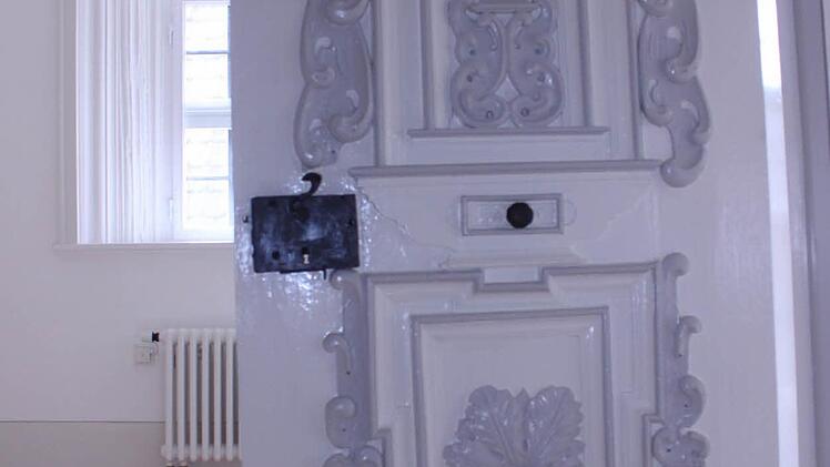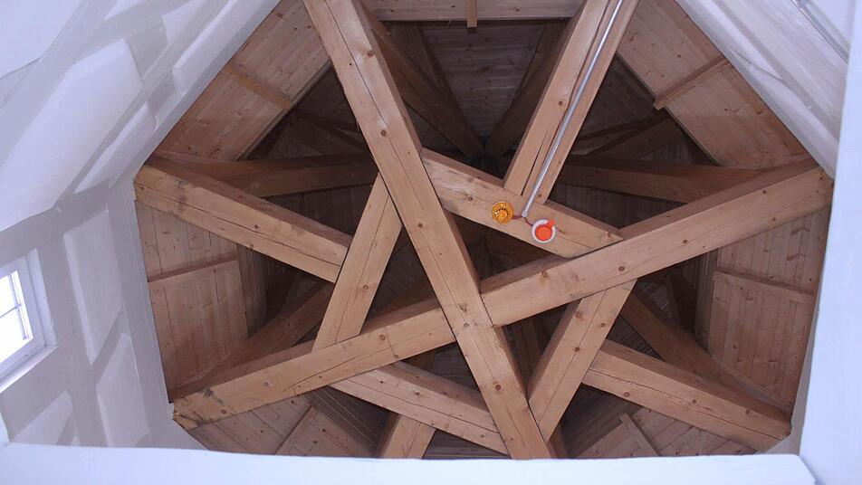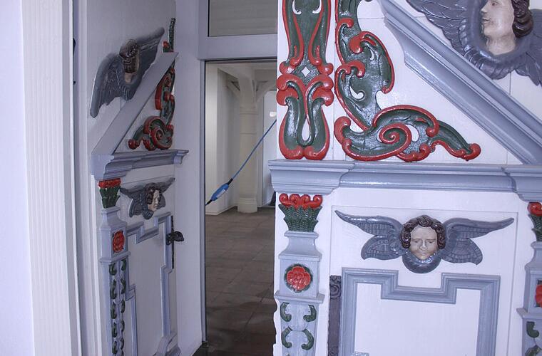 Die Gemeinderäte, die im August in dem noch provisorisch möblierten Sitzungssaal bereits eine erste Sitzung hielten, hatte Architekt Jürgen Grimme mit der Farbwahl überzeugen können. Weiß und helles Grau dominieren da, wo vorher dunkle Töne vorherrschten. Die Räume wirken dadurch größer, auch moderner. Obwohl der helle Farbton dem Urzustand näher kommt. Den Beweis findet man an einem von Restaurator Uwe Franke freigelegten Stück Balken von 1690. Die neuen Deckenleuchten und Glasabtrennungen unterstreichen den Eindruck von Helligkeit und Größe.