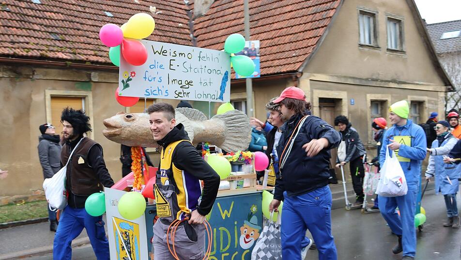 Zum Thema "Kassenbonpflicht" äußerte sich der Skiverein Weismain: "Die Kassenbonpflicht, das ist ein Graus, drum geben wir heute Schokobons raus." Die große Fußgruppe des Gartenbauvereins Geutenreuth machte ebenfalls humorvoll auf aktuelle Themen aufmerksam: "Kopf ab, ruft die Herzkönigin! Bekommt Weismain einen neuen Bürgermeister hin? Der Wahlkampf in Weismain ist sehr rasant, genauso wie das Leben bei Alice im Wunderland."