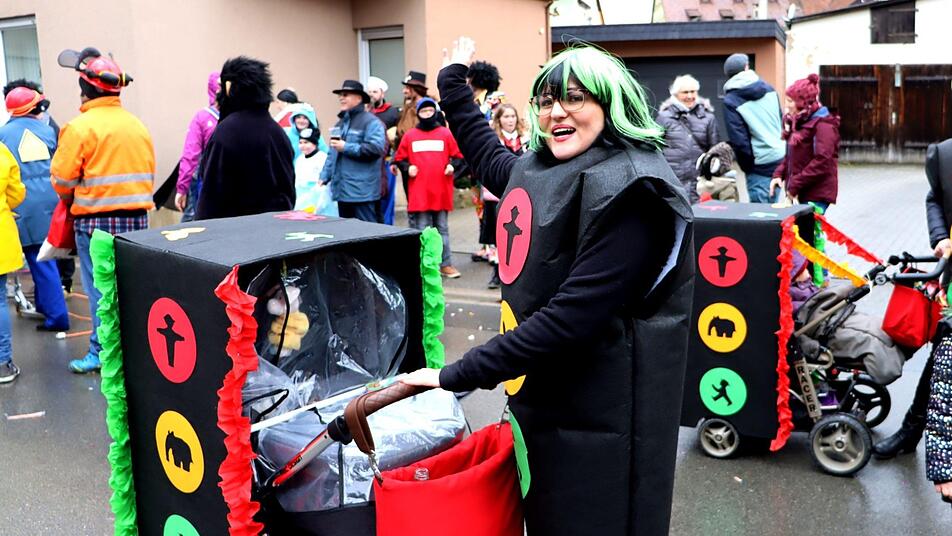 Mit ihrer bestehenden Ampel sind die Giechkröttendorfer anscheinend nicht so ganz glücklich. Der Kapellenbauverein hatte auf seinem Wagen das "Kröttendorfer Ampelmännla" mit Musik dabei.