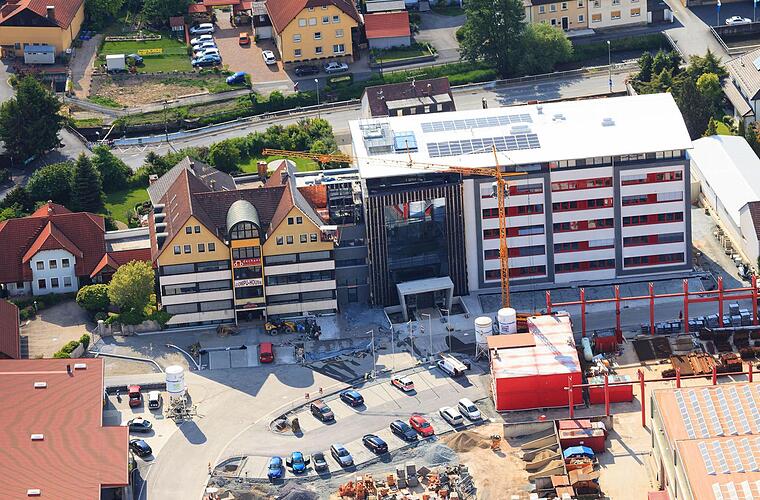 Ein dicker schwarzer Pfeil liegt noch vor allen Anforderungswerten. Im Juli wolle man das Gebäude offiziell einweihen. Den Altbau will der Unternehmer auch noch sanieren.