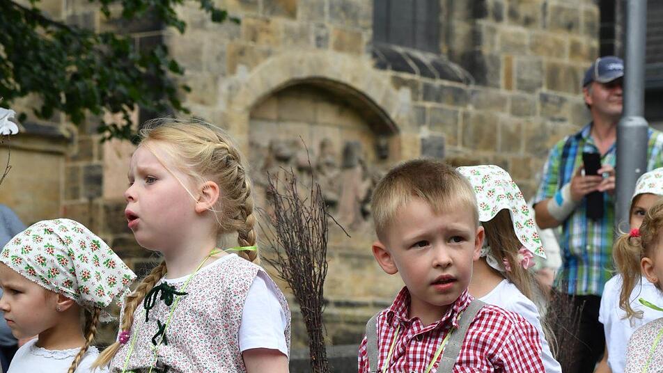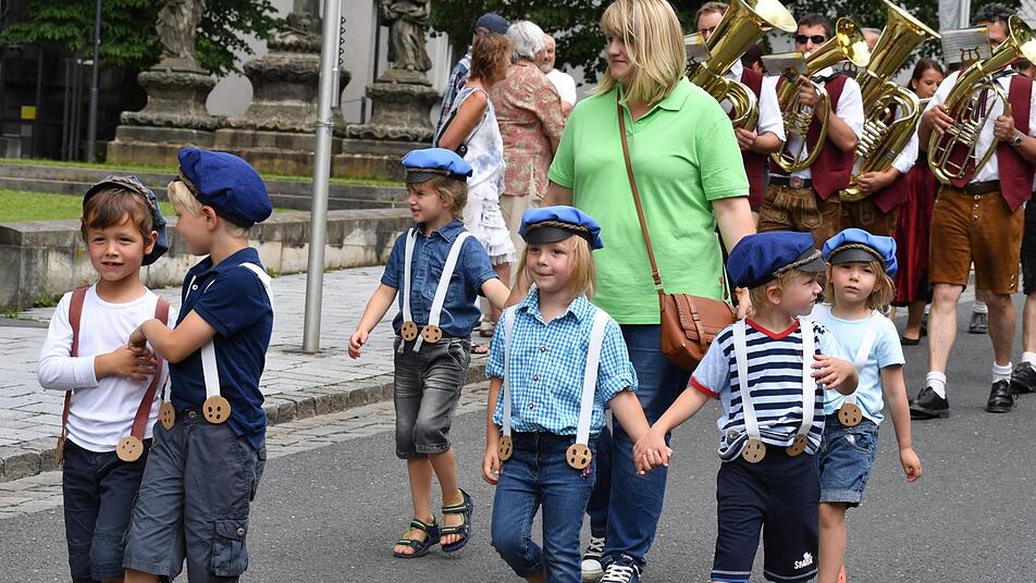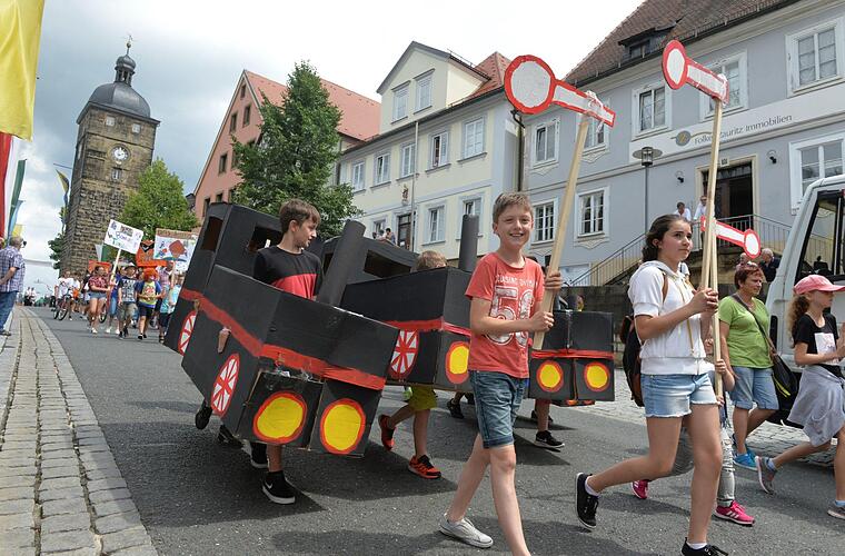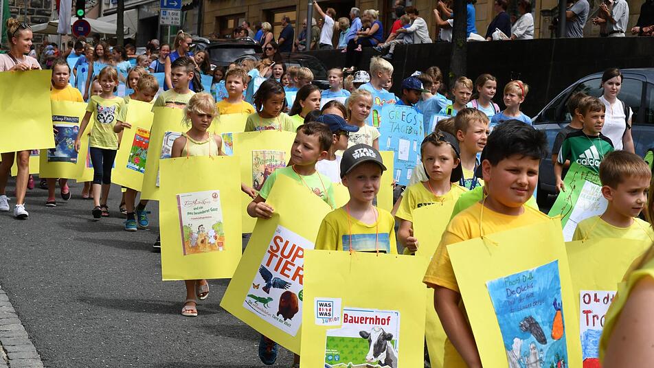 Knapp 2200 Teilnehmer hatte der Festzug in diesem Jahr, darunter etwa 1620 Kinder zwischen zwei und 15 Jahren. Sechs Kapellen und die städtische Musikschule gaben den Takt vor, Schützen und sportliche Vereine bereicherten das Bild. Man sah es den Gruppen an, dass in den vergangenen Wochen oder gar Monaten an den Schulen und Kindergärten viel Zeit in die Umsetzung des Mottos investiert worden war. Umso mehr bangten vor allem Erwachsene, dass die Mühe auch entsprechende Beachtung finden würde, denn kurz vor dem Start des Umzugs zogen dunkle Wolken auf. Das Gewitter in der Nacht zuvor bestimmte die Gespräche einiger Wartenden. Aber alles ging gut: 25 Minuten dauerte der "Bücher-Wurm", und seine Teilnehmer sollten trockenen Fußes zum Festplatz kommen. Das war schließlich die verdiente Belohnung für die Kinder und Jugendlichen.