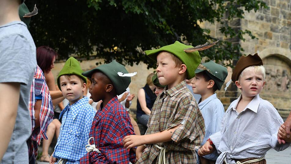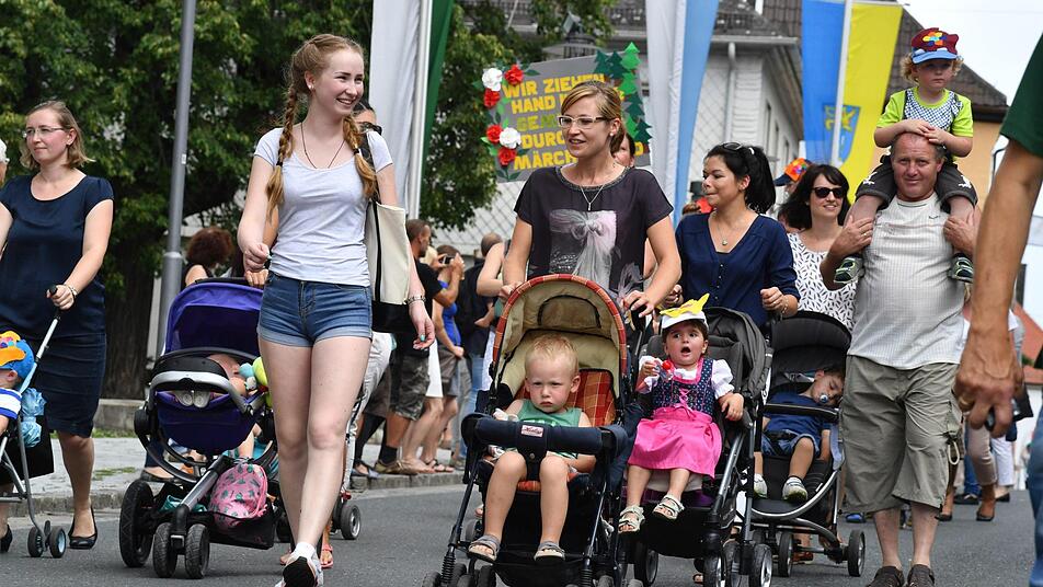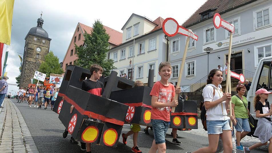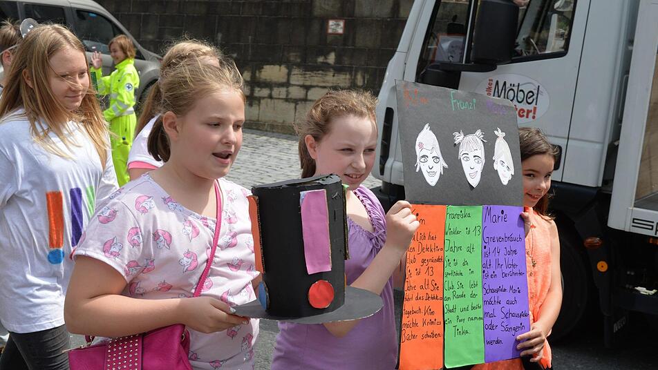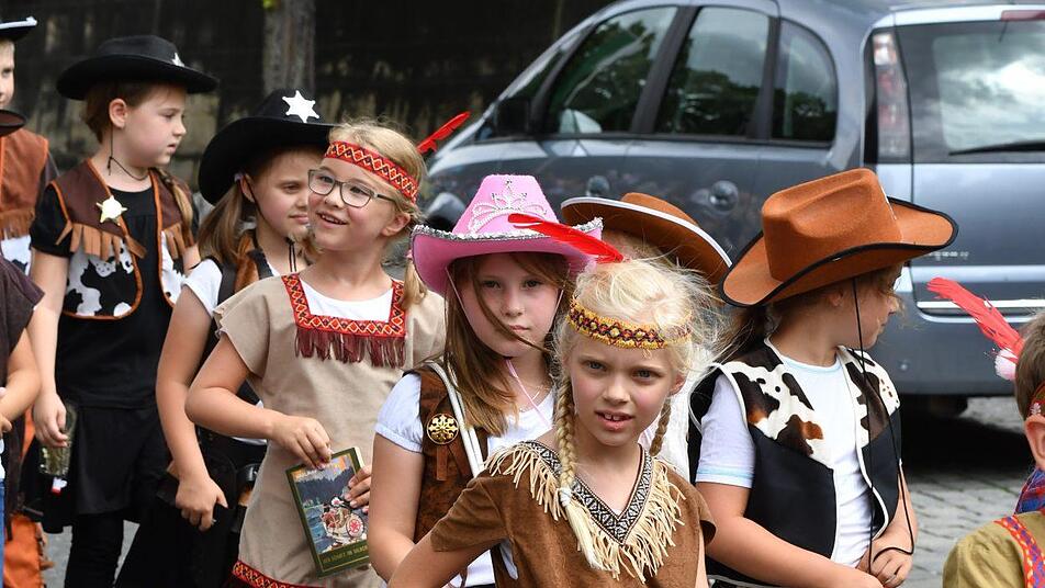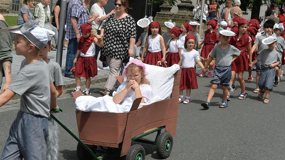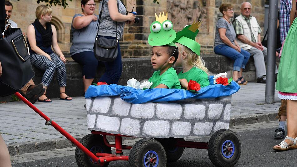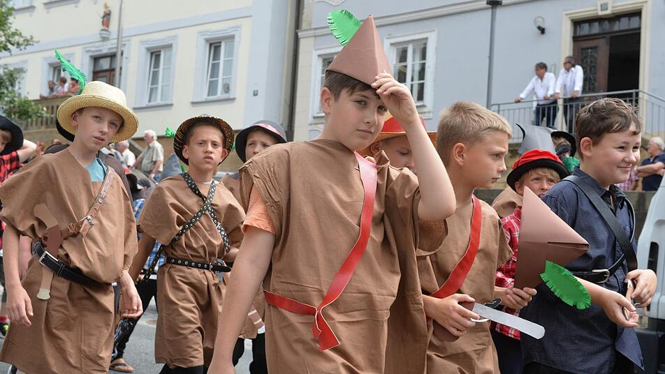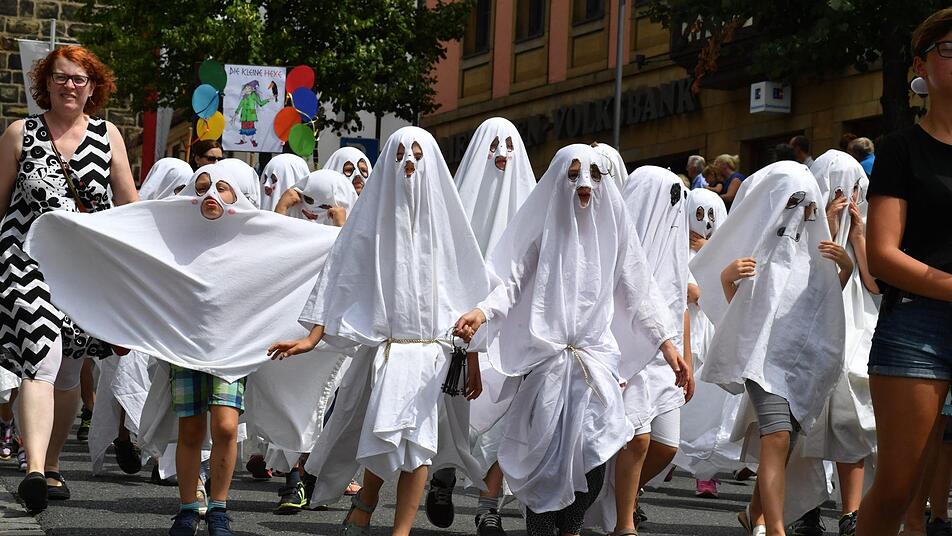 Zu diesem Motto hatte das Kopfkino natürlich jede Menge Bilder parat: "Von Astrid bis Ende - Literatur und Bücherbände". Wem fielen da nicht gleich Klassiker wie Michel aus Lönneberga, Jim Knopf und Lukas, der Lokomotivführer, oder die Kleine Raupe Nimmersatt ein? Sie alle waren beim bunten Kinderfestzug 2017 mit von der Partie. Dazu gesellten sich Märchenfiguren, die Jung und Alt gleich erkannten, Indianer und Cowboys aus Karl Mays Romanen, aber auch jüngere Buchhelden wie Harry Potter. Hier zeigten die Stadträte Humor, indem sie als Zauberschüler daherkamen, angeführt von eben jenem Bestseller-Harry (Bürgermeister Andreas Hügerich, stilecht ausstaffiert samt Eule). Flankiert wurde er von seinen Freunden beziehungsweise den Bürgermeister-Stellvertretern Sabine Rießner und Winfried Weinbeer als Hermine und Ron, Letzterer mutig mit roter Perücke.