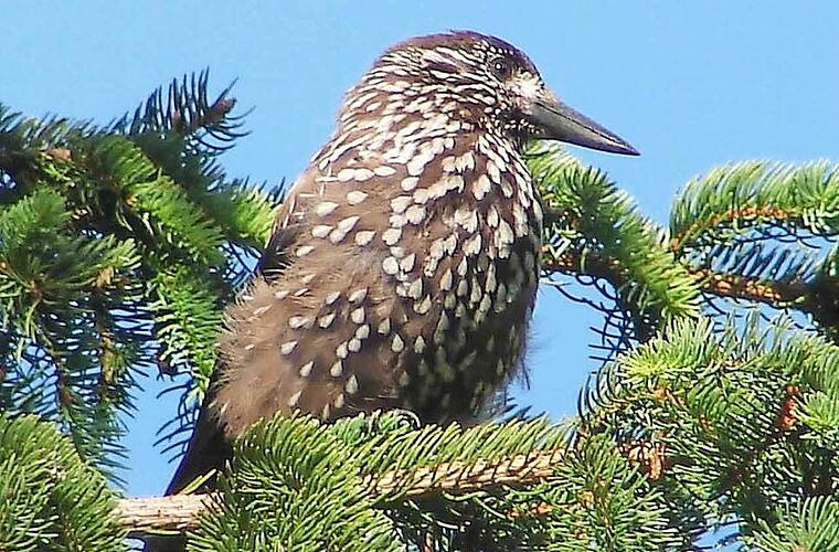 Der hübsche, weiß getupfte Tannenhäher, mit dem weniger scheuen Eichelhäher verwandt, schaut im Herbst in Dörfern und Stadträndern vorbei. Was das Tier in Siedlungen treibt, können Forscher nur vermuten.
