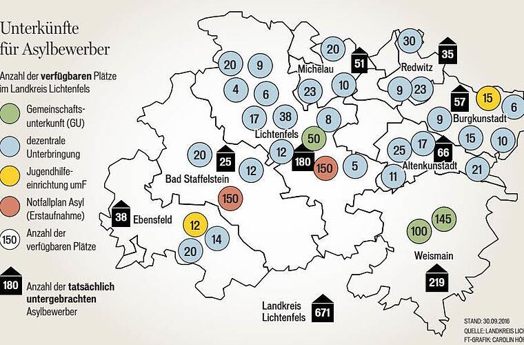 In den über den Landkreis verteilten Unterkünften leben derzeit 671 Menschen. 160 davon sind bereits anerkannte Asylbewerber, die sich auf dem freien Wohnungsmarkt eine Bleibe suchen können. Die größte Unterkunft in der Stadt Lichtenfels, das ehemalige Altenheim, wird nicht mehr benötigt. Neue Zuweisungen - es waren noch bis April 14 in der Woche - erfolgen derzeit nicht. Nur frei werdende Plätze in den Gemeinschaftsunterkünften werden von der Regierung von Oberfranken wieder belegt. Die größte Gruppe stellen Syrer.