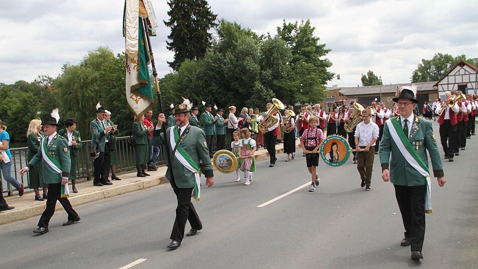 Mit den ersten Schüssen setzte sich pünktlich um 14 Uhr der große Festumzug von der Rodachbrücke aus in Bewegung. Er wurde von Fahnenträgern, den Honoratioren des Ortes, der Geistlichkeit und den Mitgliedern der Schützengesellschaft Marktzeuln unter Schützenmeister Klaus Röder angeführt In ihren schmucken Schützenuniformen boten die teilnehmenden Gruppen ein farbenprächtiges Bild.