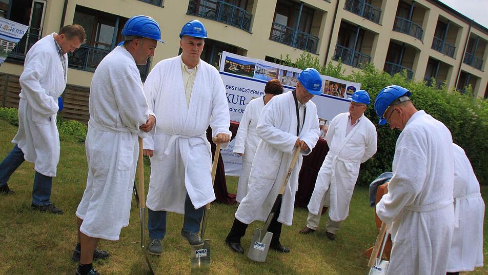 Der symbolische erste Spatenstich bildete den Auftakt zum Bau eines Bademantelganges vom Staffelsteiner Kurhotel über die Lauter in die Obermain-Therme. Das Bauwerk ermöglicht Hotelgästen, die Therme bequem zu erreichen.