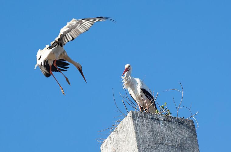 Doris Dumproff hatte sich neben Georg Himmel nicht nur mit um die Konstruktion der Horstunterlage gekümmert, sondern auch Zweige besorgt. Weiße Kalkspritzer signalisieren den Vögeln, in diesem Horst sei bereits erfolgreich gebrütet worden. Schon nach wenigen Stunden hatten die Störche ihr neues Domizil angenommen. Es wäre das dritte Storchenpaar in Michelau. Weiter fortgeschritten ist das Brutgeschäft bereits bei den beiden anderen Paaren auf dem Fabrikschlot in der Lahmstraße und auf einem Haus in der Neuenseer Straße.
