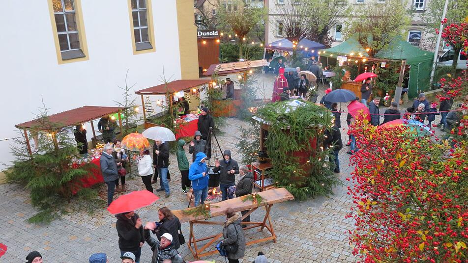 Pünktlich zum ersten Advent eröffnete auf dem Kirchplatz der Ebensfelder Weihnachtsmarkt und lockte an Ständen mit Punsch, Holzspielzeug bis hin zu selbst gemachten Strickwaren bei eher unweihnachtlichem Regenwetter zahlreiche Besucher an.