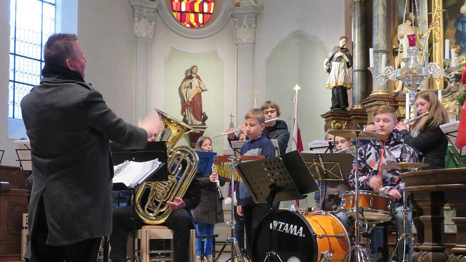 Zur Adventseinstimmung gab es "Süßer die Glocken nie klingen" und dann zeigten das Schülerorchester und ein Teil der neuen Erwachsenenbläserklasse unter der Leitung von Dirigent Reinhold Stärk von der Musikvereinigung Ebensfeld ihr gesamtes Weihnachtsrepertoire. Trotz kurzer Probenzeit, wie Querflötistin Johanna verrät, spielen die 21 Musiker gekonnt. Draußen tummelten sich derweil mit Regenschirm bewaffnete Adventsliebhaber vor den Ständen. Marlis Müller und Peter Gröppel, Urlauber aus Dresden, begutachteten die Auslage von Schreinerei Wunner und Familie Lieb, die selbst gefertigte Dekorobjekte wie Holztannenbäume und -sterne anbieten.