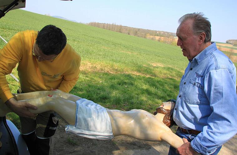 An einem schönen Frühlingstag in der Flur zwischen Kutzenberg und Prächting: Vier Männer und eine Frau bugsieren einen frisch mit Kunstharzlack eingelassenen Christus aus Eichenholz aus dem Kofferraum eines silbernen Opel Omega. Vorsichtig wird der Corpus in die Senkrechte gebracht, damit nichts abbricht. Schließlich kommt die Holzfigur gerade aus der Klosterlangheimer Werkstatt des Restaurators Richard Feulner. "Ich hab' ihm neue Finger hingemacht, und die Fußzehen waren auch kaputt", sagt Feulner.