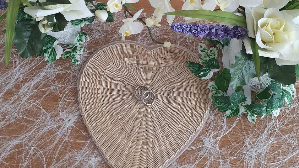 Wie oft bis dahin noch das geflochtene Herz zum Einsatz kommen wird? Wer weiß das schon. Auf dieser Unterlage liegen nämlich im Michelauer Standesamt - gut passend zur "Korbmachergemeinde" - die Ringe für zur Heirat Entschlossene bereit. Und Birgit Hucke ist seit vier Jahren dort mit Eheschließungen betraut. 2006 hatte sie als Mitarbeiterin im Korbmuseum angefangen, wechselte fünf Jahre später ins Rathaus. Für die neue berufliche Aufgabe wünschte sie sich vom Vater das herzige Deko-Objekt - eine Idee, die prompt umgesetzt wurde und den roten Faden wieder aufgreift. "Heute verflechte ich hier als Standesbeamtin Schicksale", sagt sie und lacht.