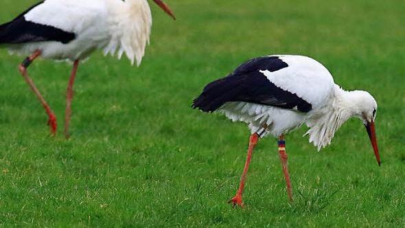 Darauf gut zu erkennen: Die beiden Vögel sind beringt. Sie tragen Markierungen aus Kunststoff oberhalb des Knies, anhand derer der Fachmann den Beringer sowie den Ort und das Datum der Beringung herausfinden kann.