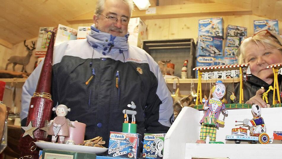 Friedrich Zürl aus Röttenbach bei Erlangen ist heuer das erste Mal als Anbieter auf dem Lichtenfelser Weihnachtsmarkt vertreten. Ein besonderer Hingucker seines Angebots ist das nostalgische Blechspielzeug. Darunter befinden sich Rennautos, Dampfschiffe, Motorräder, Clowns und verschiedene Tiere. "Die Buden auf dem Lichtenfelser Weihnachtsmarkt sind wunderschön und komfortabel ausgestattet", schwärmt Friedrich Zürl. Auch dass Strom und eine Heizung vorhanden sind, sei keine Selbstverständlichkeit, schwärmt er. Der Wermutstropfen: "Das Geld sitzt bei den Lichtenfelsern ziemlich fest", bedauert der Händler, der deutschlandweit unterwegs ist.