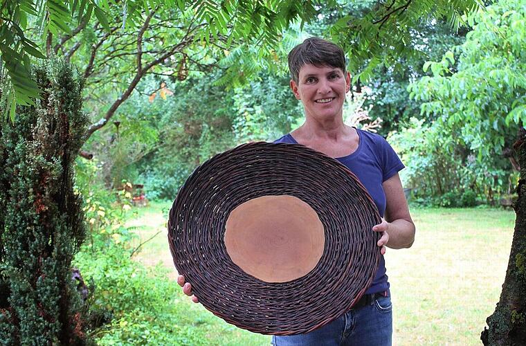 Brigitte Klitzner, die im Jahr 2011 mit Auszeichnung die Ausbildung an der Berufsfachschule für Flechtwerkgestaltung abschloss, machte aus einer Baumscheibe jener Schwarzerlen eine bemerkenswerte Schale. Sie arbeitete dabei mit ungeschälter Reifweide in der Kimmtechnik. "Das war gar nicht so einfach", erinnert sie sich, weil sie im Stehen flechten musste und das Objekt nicht befestigt war. Sie behalf sich mit Filz als Unterlage und einem großen Blumentopf als Erhöhung auf dem Tisch. Außerdem habe es recht lange gedauert, um den etwa vier Zentimeter starken hölzernen Boden von Hand so glatt zu schleifen, wie er jetzt ist.