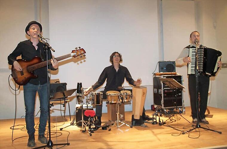Von ihrer 2014 erschienenen CD "7 Glezer" (7 Gläser), auf der sich überwiegend eigenkomponierte Stücke befinden, präsentierte die Band das Lied "zibn glezer". Von den sieben Gläsern, die wir in unserem Leben austrinken, stehen das erste für den Lebensanfang und das letzte für das Lebensende. "Die dazwischen trinkt man mit seinen Freunden", klärt Müller auf. Der "Global Shtetl Band" gehören neben Müller noch Daniel Piccon mit seinen Perkussionsinstrumenten und Bartek Stanczyk am Akkordeon an. Drei vielseitige Musiker, die sich der Klezmermusik verschrieben haben.