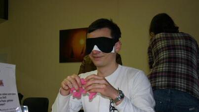 Die blinde Elisabeth Seemüller, Blinden- und Sehbehindertenberaterin beim Bayerischen Blinden- und Sehbehindertenbund (BBSB), erzählt zunächst verschiedene Situationen aus ihrem Alltag. Anschließend ist Praxis angesagt. Die Klasse muss verschiedene Aufgaben bewältigen, teils mit Dunkel- teils mit Simulationsbrille. Das "Blindenfrühstück" ist dabei ein lustiger wie lehrreicher Programmpunkt. Vor allem die beiden Lehrerinnen Gabi Kirstein und Daniela Borchert, die zuschauen, haben einiges zu lachen. Die 15 Schüler frühstücken gemeinsam mit einer Augenbinde, die ihnen das Augenlicht nimmt. Der Lärmpegel steigt gewaltig an, als die Schüler versuchen, sich mittels Zurufen zu orientieren. Dies fällt ihnen sichtlich schwer. "Oh mein Gott, jetzt hätt ich beinahe mein Käs' in Kaffee!", hört man aus dem Stimmengewirr. Manuel isst sein Brötchen mit Joghurt und Schinkenwurst. Seine Mitschülerin Patricia schmiert die Butter nicht auf das Brot, sondern auf die Tomate. "Wenn man das schüttelt, höre ich, dass das Salz ist!", sagt der 21-jährige Christian, während er den Pfeffer in der Hand hält.