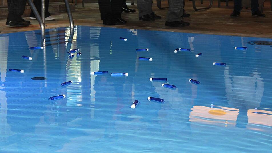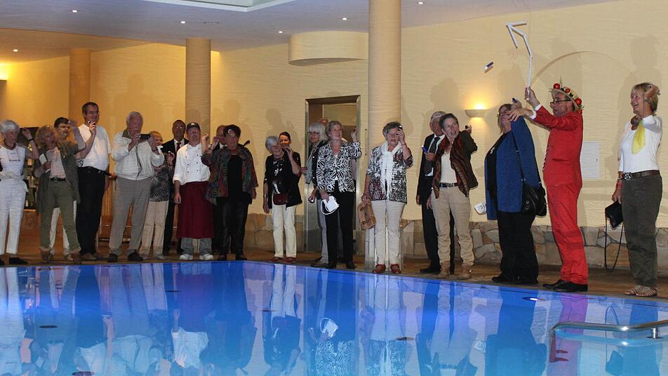 Das Licht ist gedämpft. Im Blau des Schwimmbecken spiegeln sich die Wände. An einigen Ecken liegen gerollte Handtücher auf den Liegen. Dampfbad, Biosauna und die Infrarotkabine warten auf Gäste. Soweit stimmt die Atmosphäre für einen Wellness- und Saunabereich. Nur eines passt nicht ganz: die vielen fein gekleideten Menschen in Anzügen und Kleidern.