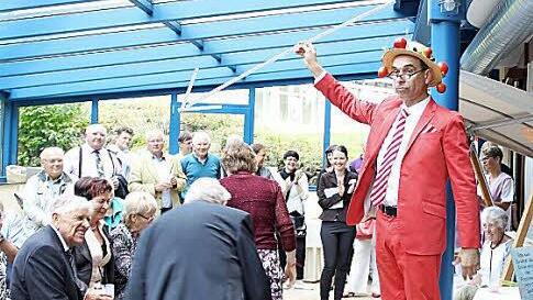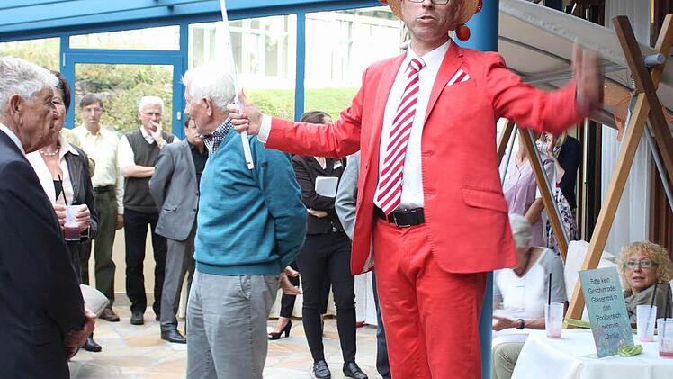 Für die Eröffnung hatten sich die Verantwortlichen etwas Ungewöhnliches einfallen lassen. Schorsch, ein mit rotem Anzug und Tomaten am Strohhut gekleideter Moderator, führte die Gäste durch die Räume und unterbrach die Reden von Poth, Bürgermeister Jürgen Kohmann (CSU) und anderen mit witzigen Bemerkungen. Mit einem Zollstock formte er Zeichen und Figuren, die seine frech-ironischen Bemerkungen verstärkten.