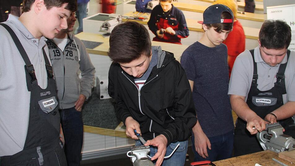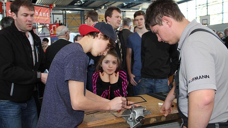 Erst Ausbildungsmesse, dann Schnupperpraktikum An vielen Messeständen waren die Auszubildenden der Unternehmen die ersten Ansprechpartner. Ein Angebot, das von zahlreichen Jugendlichen genutzt wurde. "Auf der Ausbildungsmesse findet oft der erste Kontakt statt. Danach kommt ein Schnupperpraktikum", sagt Norbert Werner, Leiter Betriebstechnik bei Moll Batterien in Bad Staffelstein. Einige Messestände weiter ist Luisa Schulz, Auszubildende im dritten Lehrjahr bei der Firmengruppe Hofmann gerade dabei Florian Zeitler zu zeigen, was im Verlauf eines Praktikums angefertigt wird.