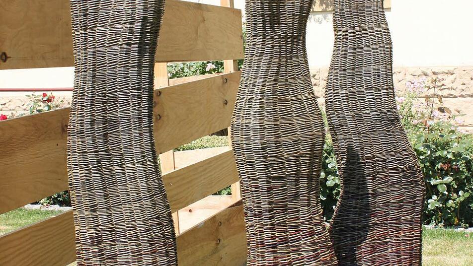Elke Hegmann aus Nürnberg war von der Ausstellung "Geflecht als Kunst" zum Korbmarkt 2013 so begeistert, dass auch sie große Skulpturen in organischen Formen wie dort zu sehen flechten wollte. Für die Mittelfränkin begann mit ihrer Handwerksausbildung ein neuer Lebensabschnitt. 20 Jahre lang hatte sie als Fremdsprachenkorrespondentin gearbeitet, war aber nicht mehr glücklich im Büro, wünschte sich eine Veränderung. Vom Flechthandwerk wusste sie bis dato wenig. Ein Gespräch mit Bekannten gab den Anstoß, sich zu informieren. Inzwischen plant die 48-Jährige, sich mit einer eigenen Werkstatt selbstständig zu machen und ist dankbar für die Unterstützung, die sie von ihrer Familie während der Ausbildungszeit erfahren hat. Dass sie das Richtige für sich gefunden hat, merkt man ihr an. Bei der Präsentation ihrer drei Stelen aus ungeschälter Weide strahlte sie und sagte: "Ich betrachte das nicht nur als Arbeit. Ich habe meine Bestimmung gefunden. Ich stehe früh auf und will flechten."