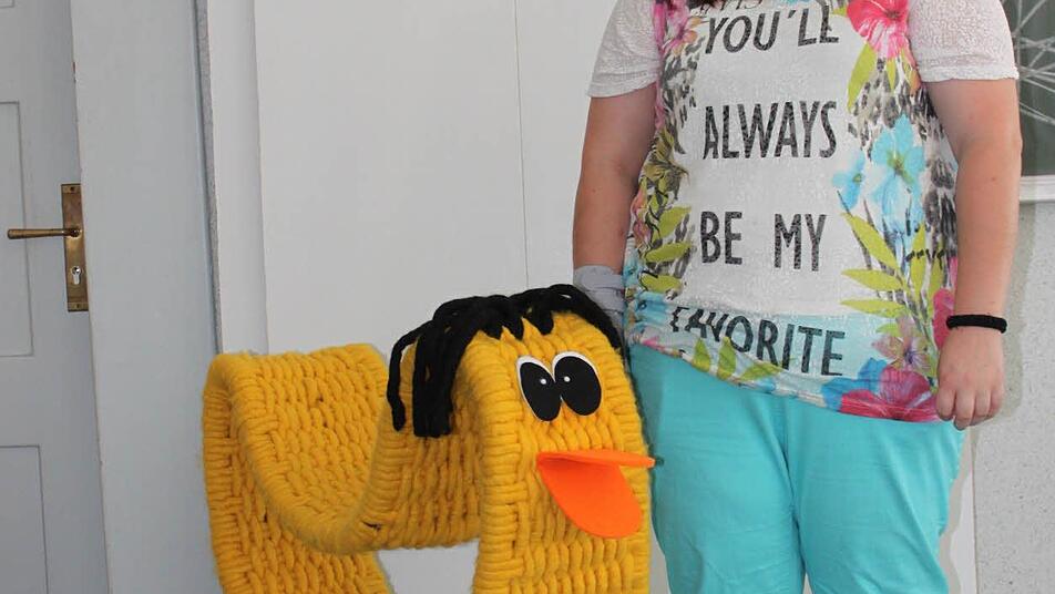 Denise Wunderer aus Mitwitz hat Manila-Rohr gebogen und mit weichem Material ausgeflochten, so dass eine gelbe, niedlich anzuschauende Schaukelente für ihr Kind entstanden ist.