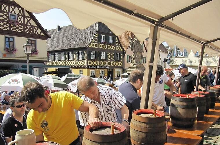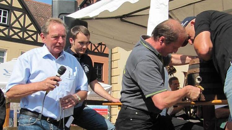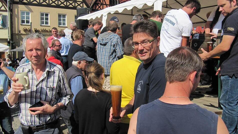 Noch ist es nicht 10.30 Uhr, noch spielt Michael Diller mit seiner Staffelsteiner Blaskapelle zum zünftigen musikalischen Frühschoppen auf. Doch schon bildet sich eine Schlange von Festbesuchern, die die Ersten sein möchten, wenn es nach dem offiziellen Bieranstich heißt: "Es gibt Freibier!" Heuer haben zum ersten Mal alle zehn Staffelsteiner Brauer teilgenommen. Jeder hat ein feines Stöffchen dabei, teils eigens für das Fest eingebraut. Wenn der Anstich im Beisein von Bierkönig Hartwig I., Bürgermeistern und Stadträten erfolgt, haben die Brauer schon ein paar anstrengende Stunden, ja Wochen hinter sich.