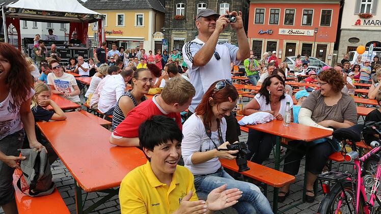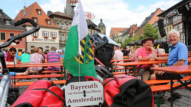 Aus der Nähe von Chemnitz stammend befindet sich das Rentner-Ehepaar auf einer allen Berechnungen nach 13-tägigen Fahrradfreizeit in Richtung Amsterdam. "Spontan bei Lichtenfels vorbeigekommen", sei man. Die Strecke habe das hergegeben. 80 bis 100 Kilometer Strecke legt das in Groß touren erfahrene Ehepaar täglich zurück. Jetzt sitzt es auf dem Marktplatz und genießt das Treiben. Gerade spielten Christian Bauer & Friends auf der Bühne, nun formiert sich vom Fitness-Studio "fit'n fun" eine Zumba-Gruppe auf der Bühne.