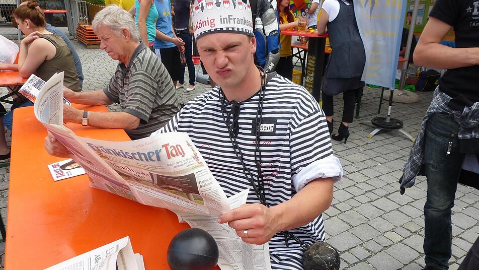 In einer Sträflingsmontur hat es ihn und Freunde zu einem Junggesellenabschied aus dem thüringischen Dorfilm nach Lichtenfels verschlagen. "Ich musste in den Zug steigen, wusste nicht, wohin es geht, dann hieß es: aussteigen", sagt er. Sein Grimm ist verflogen, er hat eine Ausgabe des FT in der Hand, lässt am Info-Stand ein Scherzbild von sich und seinen Kumpels anfertigen und sieht gut gelaunt seiner Vermählung entgegen.