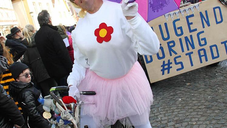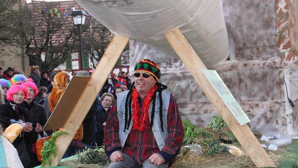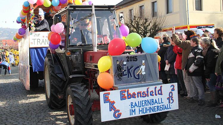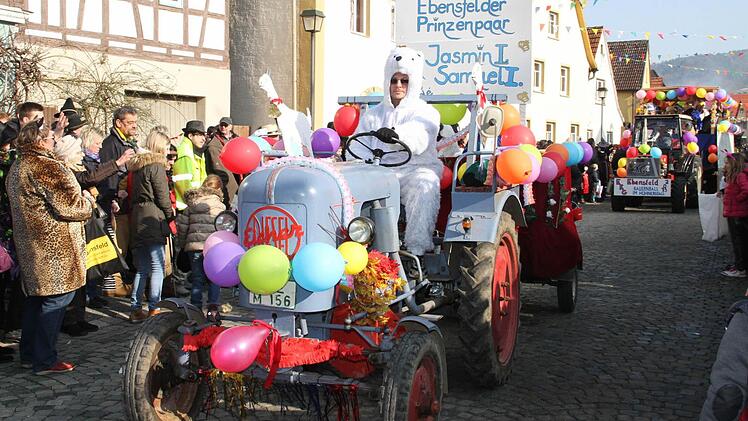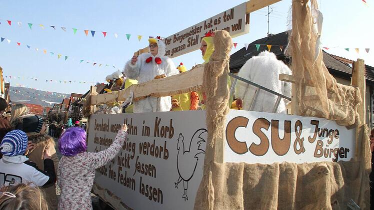 Heuer nahmen 43 Gruppen am Umzug teil. Als erster Wagen grüßte jener der Gemeinde Ebensfeld den Rest der Narrenwelt. Als Huhn verkleidet streute Bürgermeister Bernhard Storath (CSU) allerhand milde Gaben unters Volk. Die CSU und die Jungen Bürger hatten auf ihren Wagen geschrieben: "Der Bürgermeister hat es toll, den ganzen Stall mit Hühnern voll." Auch das Ebensfelder Kinderprinzenpaar Jasmin I. und Samuel I. wurde seiner Rolle gerecht und verteilte Süßes.