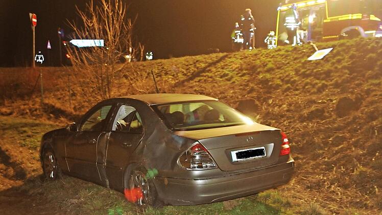 Im Acker endete am Freitagabend die Fahrt eines Mercedes nahe der Ausfahrt Bad Staffelstein-Kurzentrum. Davor war er mit einem Audi Q5 kollidiert, der in Richtung Badstadt abbiegen wollte. Beide Mercedes-Insassen wurden leicht verletzt und mit einem Krankenwagen ins Klinikum gebracht. Der Sachschaden wurde von der Polizei auf rund 20 000 Euro geschätzt. Foto: Andreas Schmitt
