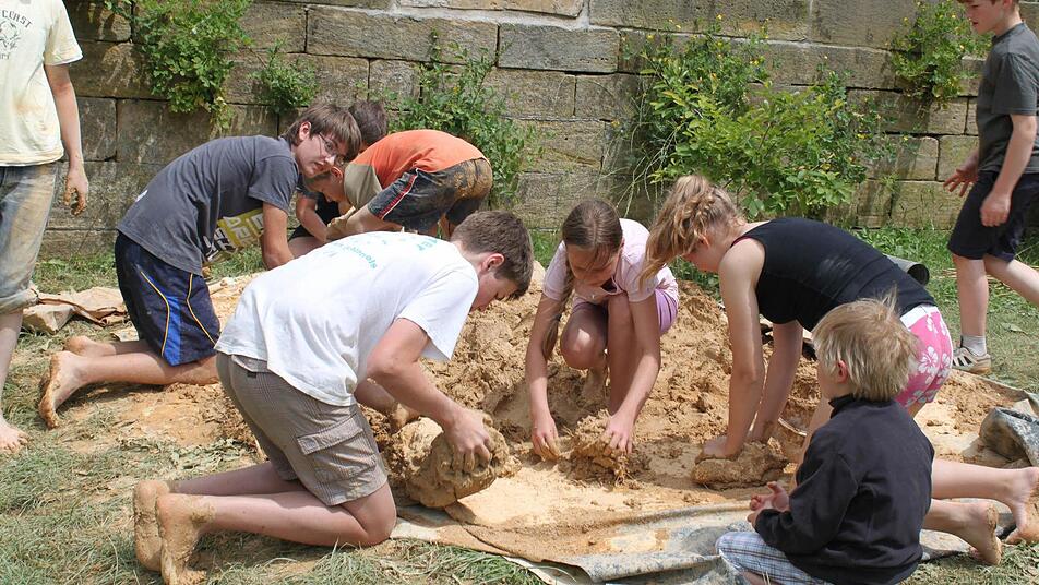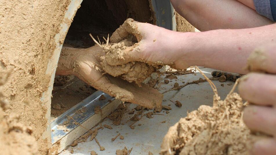 Kinder stellen den Baustoff her Drei Meter entfernt stehen Kinder im Lehm. Ihre Füße sind bloß, dreckig ist gar kein Ausdruck. Die "Turmfalken", so nennen sie sich, verkneten Tonmehl, Sand und Stroh zu einer breiig-festen Masse. So wird der Baustoff gemacht. Ein Traktor steht auf der Wiese, in seiner Schaufel ist Sand; Heuballen liegen daneben, und das in der Nähe befindliche Tonmehl stammt von einer Ziegelei. Auch am Tag zuvor wurde schon ein Lehmgemisch hergestellt, heute sorgen die Hände der Erwachsenen dafür, dass der Lehm zu Ofenwänden wird. "Je dicker die Wand, umso mehr Wärme kann sie speichern, umso größer das Brot", sagt Michael Stromer.
