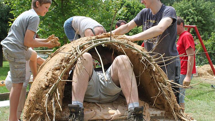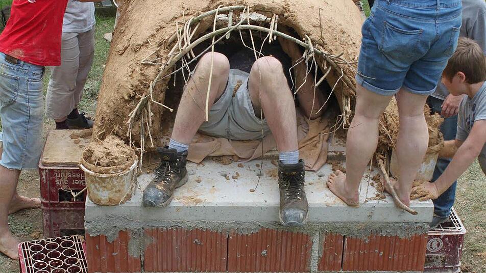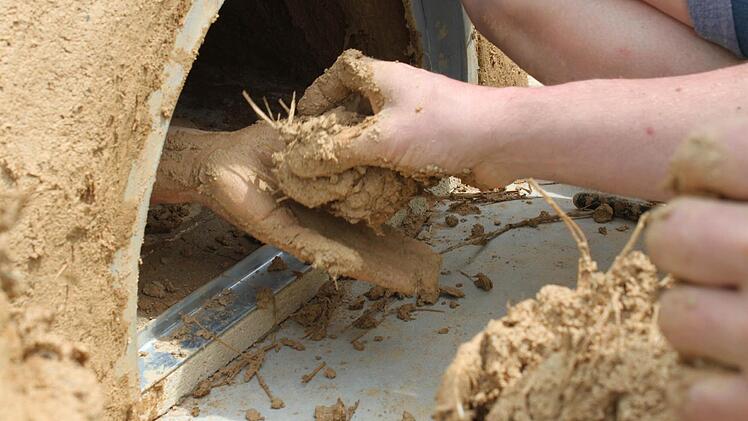 Eigentlich ist die Idee, einen Lehmbackofen zu bauen schon relativ alt. Die Umsetzung hat sich nur verzögert. Schon 2011 soll aus der Jugendgruppe, den "Turmfalken", der Wunsch geäußert worden sein, einen Lehmbackofen zu bauen. Man hatte wohl davon gehört, dass damit Pizza gebacken werden kann. Und Brot. Und sogar Spanferkel, wie Kreisfachberater Michael Stromer versichert. Als der Leiter der Umweltstation das sagt, drückt er einem anderen Mann mal wieder einen Lehmklumpen in die Hand. Dieser andere Mann aber ist nicht zu sehen, denn er steckt in dem halb fertigen Ofen und klatscht den Lehm von innen an die Wände.