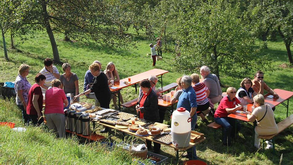 Die Erwachsenen haben da eher schon die Qual der Wahl am reichhaltigen Küchenbüfett unter freiem Himmel. Apfelkuchen unterschiedlichster Zubereitung dominiert das Angebot. Neben Kaffee gab es auch frisch gepressten Apfelsaft.