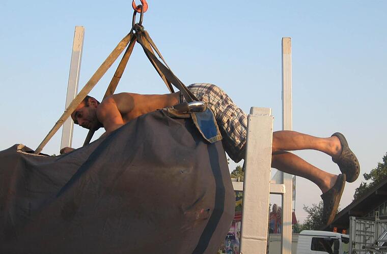 Das Installieren beginnt Während er das sagt, steht sein Sohn Nico Schulz mit einer Fernbedienung vor dem "Break Dance". Die Zugmaschine mit dem Ferrari-Kran lässt sich so auch außerhalb des Fahrzeugs bedienen. Bevor der Kran eine Gondel anhebt, um sie auf die Plattform des "Break Dance" zu schwenken, muss Zdzisek Zdunko diese verlassen haben. Der Pole liegt bäuchlings auf ihr, weil dies im Moment die bequemste Haltung für einen bestimmten Handgriff ist. Zdunko - freier Oberkörper, braun gebrannt, Tiefenbräune sogar, gutes Deutsch, nicht frei von Akzent.