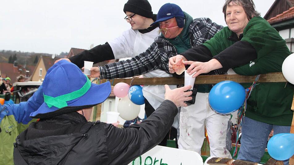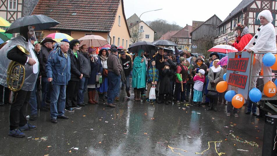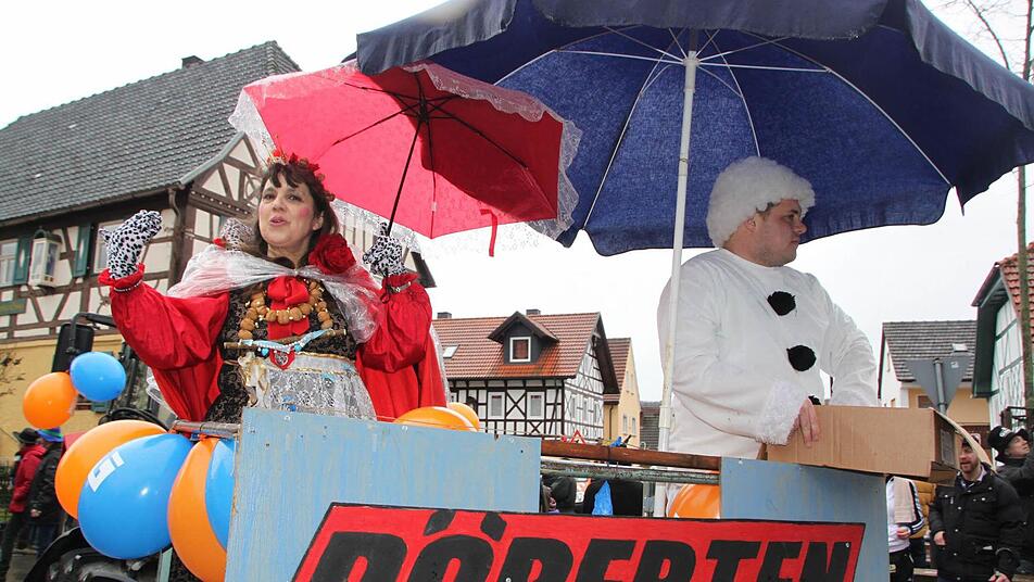 Geduscht von Regenschauern wurden Zugteilnehmer und Zuschauer beim "Döberten-Express". Marianne Dinkel hielt ihre Büttenrede als Walnuss-Königin.