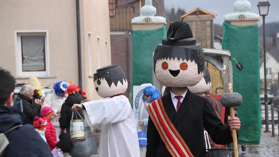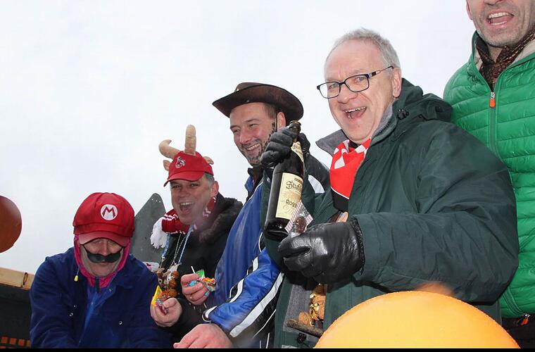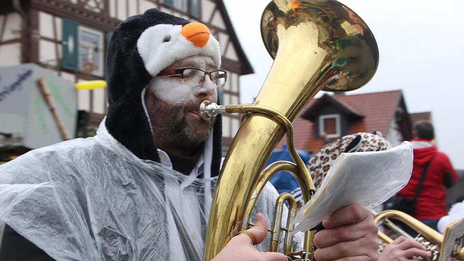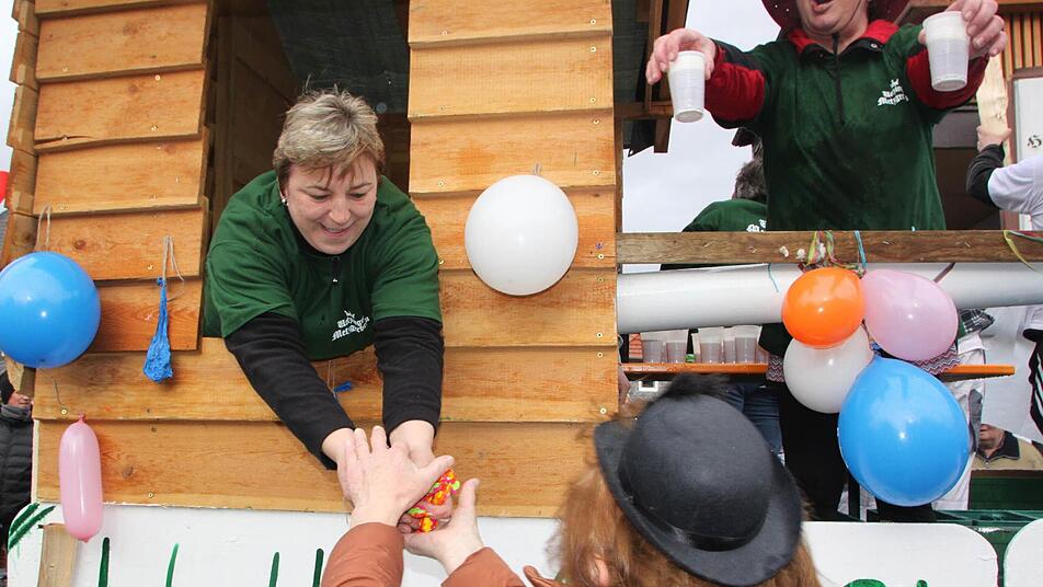 Trotz des Schmuddelwetters ließen sich die Narren den Spaß nicht verderben. "Die Uetzinger feiern nur dann nicht, wenn die Hölle gefriert", scherzte eine Passantin. Und so zogen die bunten Gruppen mit ihren Wagen durch den strömenden Regen von den "oberen Dörfern" nach Uetzing. Punktgenau mit dem Eintreffen des Faschingszugs hatte der Himmel ein Einsehen - es hörte auf zu regnen, die Schirme wurden für kurze Zeit zugeklappt.
