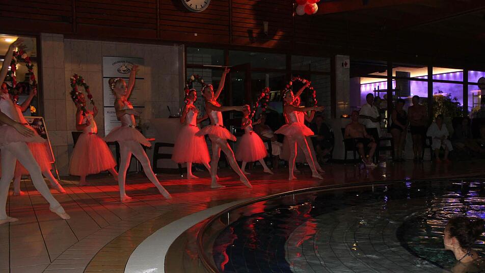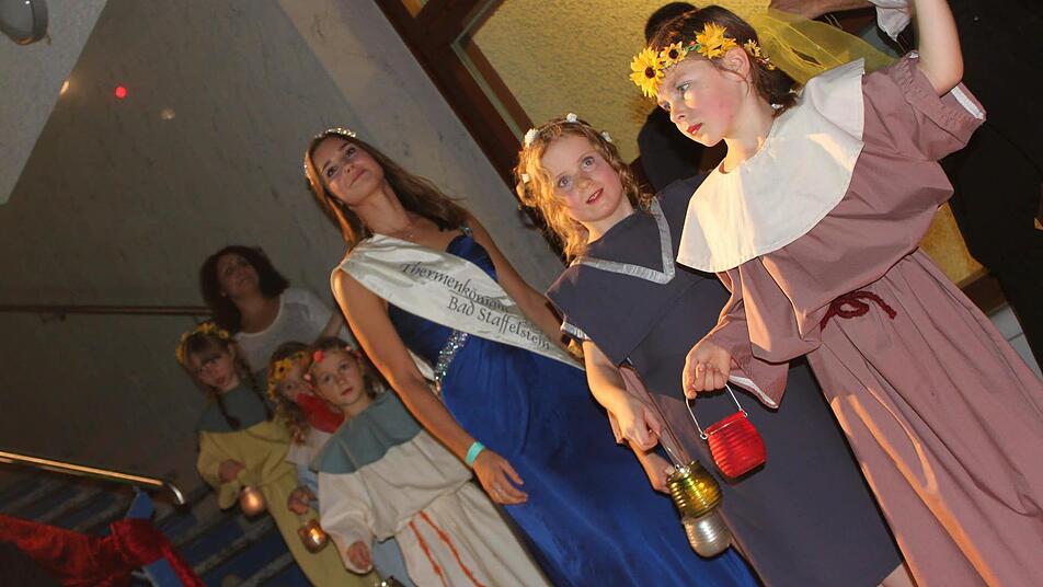 Moderatorin Uli Noll von Radio Eins hielt zwischen Live-Musik und Tanzdarbietungen die Spannung aufrecht, bis kurz vor 21 Uhr das Geheimnis um die neue Thermenkönigin gelüftet wurde. Dann ging alles ganz schnell: Madeleine schritt, von Blumenkindern begleitet, die Treppe in die große Badehalle hinunter. "Time to say goodbye" erklang, und die Besucher im Becken ließen sich nicht zweimal auffordern, passend dazu zu winken. Ein herzlicher Dank und Blumen; dann nahm Bürgermeister Jürgen Kohmann (CSU) der scheidenden Königin die Krone ab.