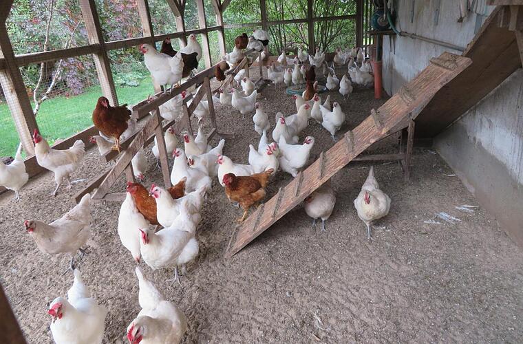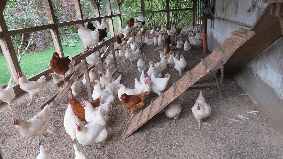 Bernhard Storath ist Biobauer. Wer das Anwesen der Familie Storath in der Unteren Straße besucht und einen Blick ins Hühnergehege wirft, dem fällt erst mal nichts Besonderes auf. 300 Tiere laufen hier herum, braune, weiße, gemusterte, mit weißen oder mit bläulichen Füßen. Es wird gescharrt, gepickt, gegackert. Zuerst fallen die Hähne auf: Fünf stattliche Tiere sind es inmitten der Hennen. Das ist ungewöhnlich. "Die Hähne regeln von Anfang an, wer der Chefhahn ist, dann ist Ruhe", erklärt Bernhard, warum es unter den Hähnen keinen Zickenkrieg gibt. Normal wäre ein Hahn.