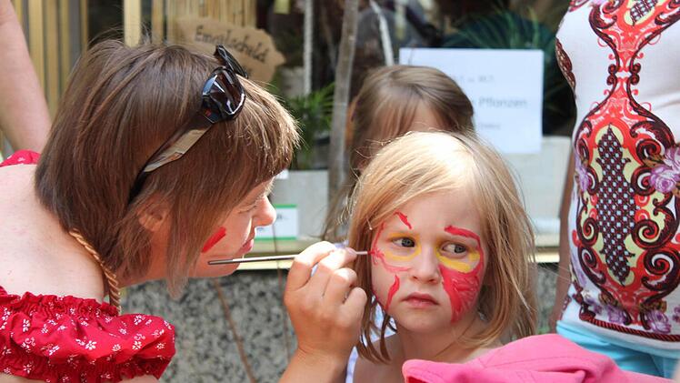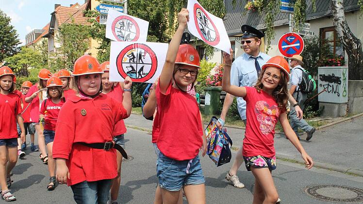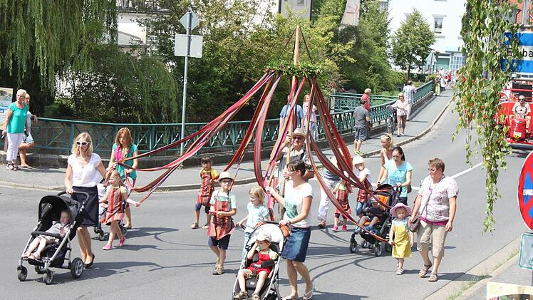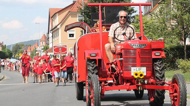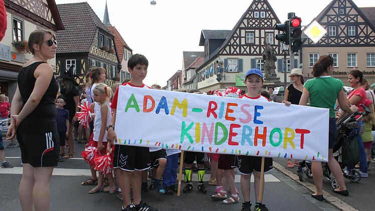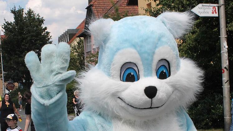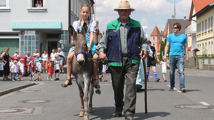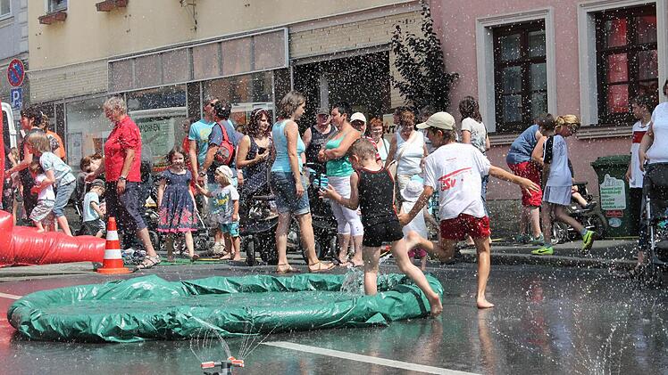In einer Nebengasse wartet der Umzug auf das Startsignal von Anke Otte, eine der Organisatorinnen. Los geht es: Den Anfang macht der Musikwagen und ein Esel. Dahinter die Jungen und Mädchen des Kinderhauses St. Johannes aus Uetzing als "Swimmi und seine Freunde". Auch die im vergangenen Jahr gegründeten "Löschquerkerla" der Staffelsteiner Feuerwehr waren dabei. Am Rathaus angekommen verteilen sich Kinder, Eltern und Besucher an den Ständen. Torwand schießen, Schminken oder planschen am Stadtturm - ein willkommene Abkühlung bei strahlender Sonne. Noch bis zum Abend schallte Kinderlachen- und freudiges Jauchzen schallt durch die der Innenstadt.