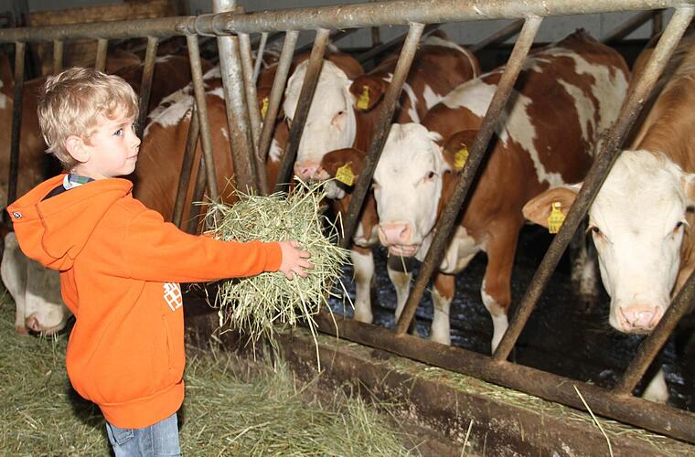 Nicht nur die Kinder sind neugierig auf das, was es auf dem Bauernhof zu sehen gibt: Auch die Kühe sind an dem ungewohnten Besuch interessiert.