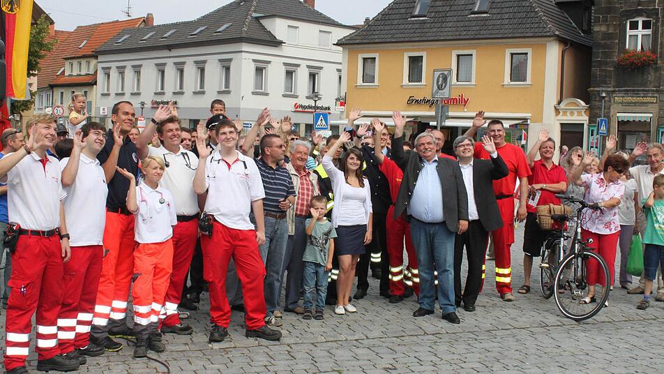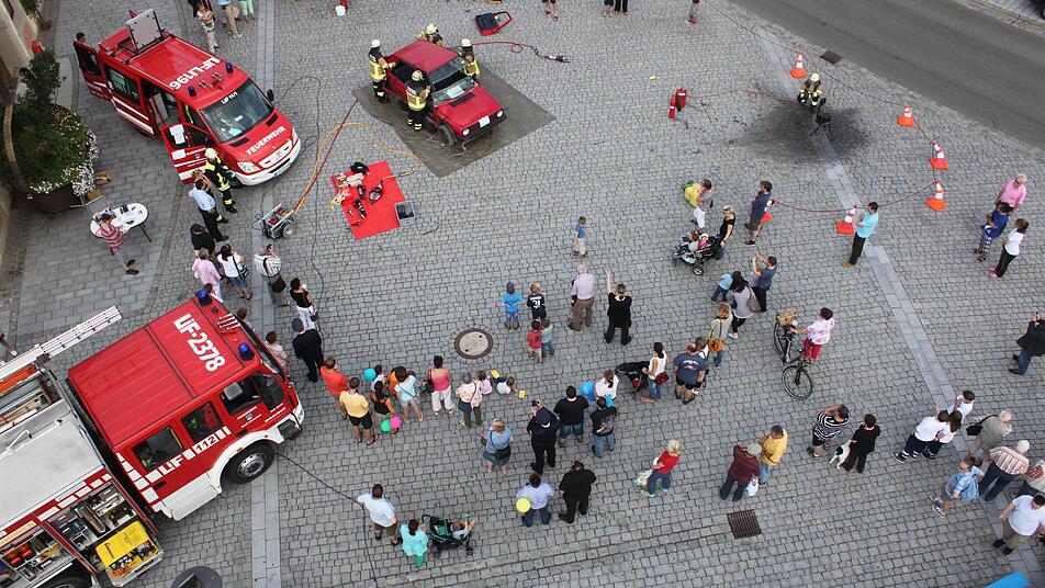 Es kommt auf den Standpunkt an. Wer den Marktplatz betrat, der mochte meinen, ihn belebt zu sehen. Von der Drehleiter der städtischen Feuerwehr aus betrachtet, 30 Meter über dem Pflaster, waren viele Punkte zu sehen und zwischen den Punkten freilich immer noch gehörig Platz. Und irgendwo da unten drehten Thomas Meyer und die Korbstadtkönigin Helena I. auch noch die letzte Sequenz für den Imagefilm der Stadt Lichtenfels.