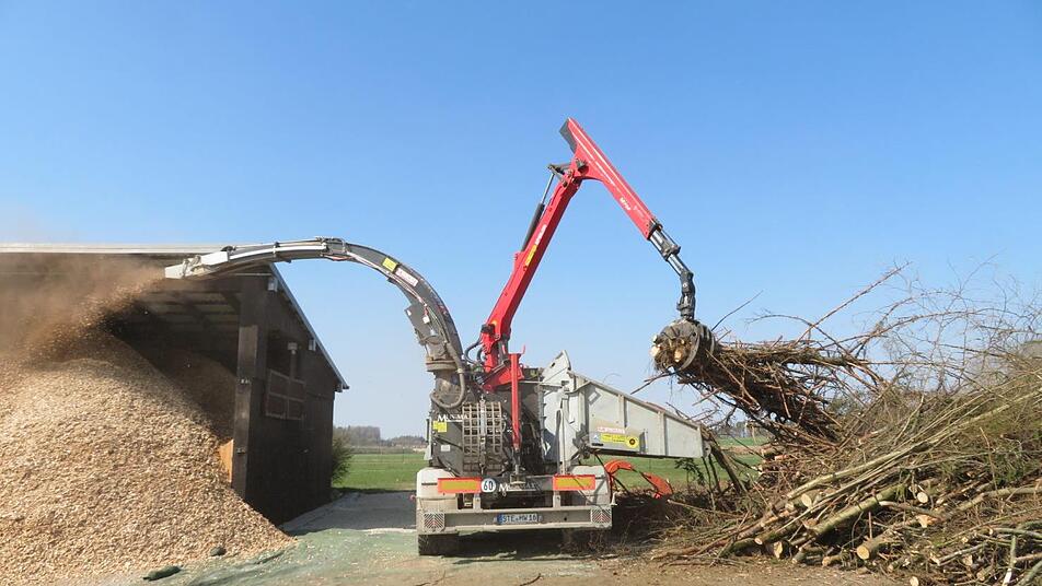 Die Familie Göring aus Lahm hat sich zur Selbstverwertung entschieden. Früher wurden Geäst und Reisig verbrannt. Die Trockenheit und Auflagen zwangen zu Plan B. Der Bau einer Hackschnitzelanlage ist nun geplant. Die Görings haben Matthias Würstlein mit seinem Häcksler bestellt. Seine beiden Fahrzeuge stehen auf dem Anwesen am Ortsrand von Lahm. Aus seinem mehrere Meter hohen John Deere könnte der Fahrer ohne weiteres in den ersten Stock eines Wohnhauses einsehen. Doch an diesem heißen Donnerstag hat Matthias Wichtigeres anderes vor: Mit dem Greifer fasst seine Maschine die fünf Meter langen Baumstämme, Käferholz, die der Landwirt schon aus dem Wald gezogen und bereitgelegt hat. Stück für Stück verschwindet es in der Öffnung des Häckslers, um mit ziemlichem Lärm und Getöse und noch mehr Staub als Hackschnitzel auf der andren Seite in die offenen Lagerhallen der Familie geblasen zu werden. "Holz und Stämme von 80 Zentimeter Höhe und einem Meter Breite fasst die Öffnung", sagt der junge Fahrer. Kiefer, Fichte, Eiche - alles verschwindet im Einfülltrichter und kommt in der Qualitätsgüte "G 30" nach nicht einmal 60 Sekunden zur anderen Seite heraus. Dann sind die trockenen Giebel und Kronen dran. Der Greifer packt zu, der große Haufen wird ruckzuck abgearbeitet. Nachbarn schauen zu.