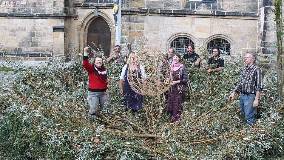 Ein "Walking Act", so viel er auch geht, muss sich einmal zur Ruhe begeben und hinlegen. Der Walking Act, dass sind die Dundus, jene riesenhaften Marionetten, die den Korbmarkt besuchen und beleben. Zur Ruhe begeben können sie sich auch, denn ihr Bett ist ihnen bereitet. Mehr als das sogar: Ein Village, ein Dorf also, steht ihnen zur Verfügung. Auf dem Rasen vor der Stadtpfarrkirche ist den Dundus am Donnerstag ein Bett und eine Art Wohnwerkstätte geflochten worden.