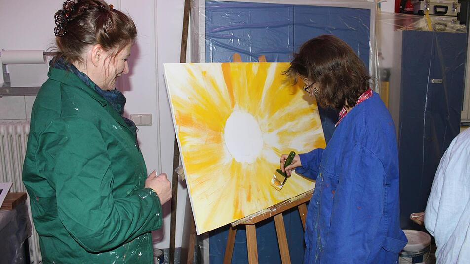 "Kunst kann alles - alle können Kunst" lautet das Motto, wenn über die Offene Behindertenarbeit so eine kreative Freizeitbeschäftigung angeboten wird. "Wir haben schon manches Kunstprojekt gemacht, aber nicht mit der Vielzahl von Materialien, wie es hier möglich ist", hebt Ivonne Hagenbucher die Besonderheit des Schaffens in einer Profi-Werkstatt hervor. Da gibt es nicht bloß großformatige Leinwände und Acrylfarben. Da können auch Holzplatten in Schiefertechnik und mit Blattgold oder -silber gestaltet werden. Neue Materialien, neue Techniken, neue Herausforderungen. Von den sechs festgelegten Terminen ist die Halbzeit gerade überschritten und jedes Mal wird die Reihe der fertigen Werke um weitere Exemplare ergänzt. "Dieses Bild hier", sagt der Malermeister auf eines davon verweisend, "zeigt eine ganz hohe künstlerische Begabung." Schon jetzt steht fest, dass alle Werke in einer Versteigerung neue Eigentümer finden und damit einem sozialen Zweck dienen sollen. Ganz im Sinne des rotarischen Gedankens also. Das war auch bei früheren Kunstprojekten des Clubs so, etwa mit Schülern der Gymnasien Burgkunstadt und Lichtenfels. Für die Teilnehmer - zwischen Mitte 20 und Ende 40 übrigens - steht ganz offensichtlich nicht der Erlös, sondern die Freude am Tun im Vordergrund. "Es macht Spaß, Malen ist mein Hobby", sagt Elfriede Hauptmann. Ob Schildkröte, Blumenwiese oder Sonne: Ihre Motive zeigen, dass sie leuchtende Farben mag.