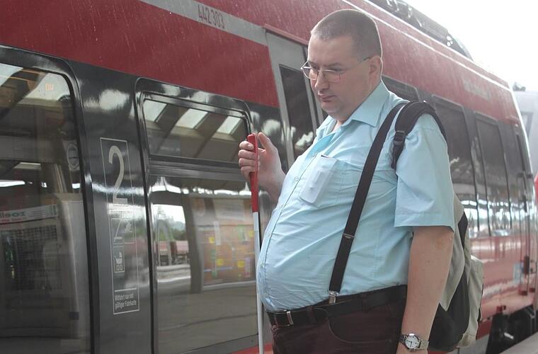 Rainer Hader geht die Stufen des Bahnhofs langsam hinauf. Obwohl wir verabredet sind, läuft er an mir vorbei. Sein Stock streicht über den Boden - links, rechts, links, rechts. Die Menschen drehen sich um, starren den Mann im blauen Hemd an. Er aber sieht sie nicht - kann sie nicht sehen. Rainer Hader ist blind.